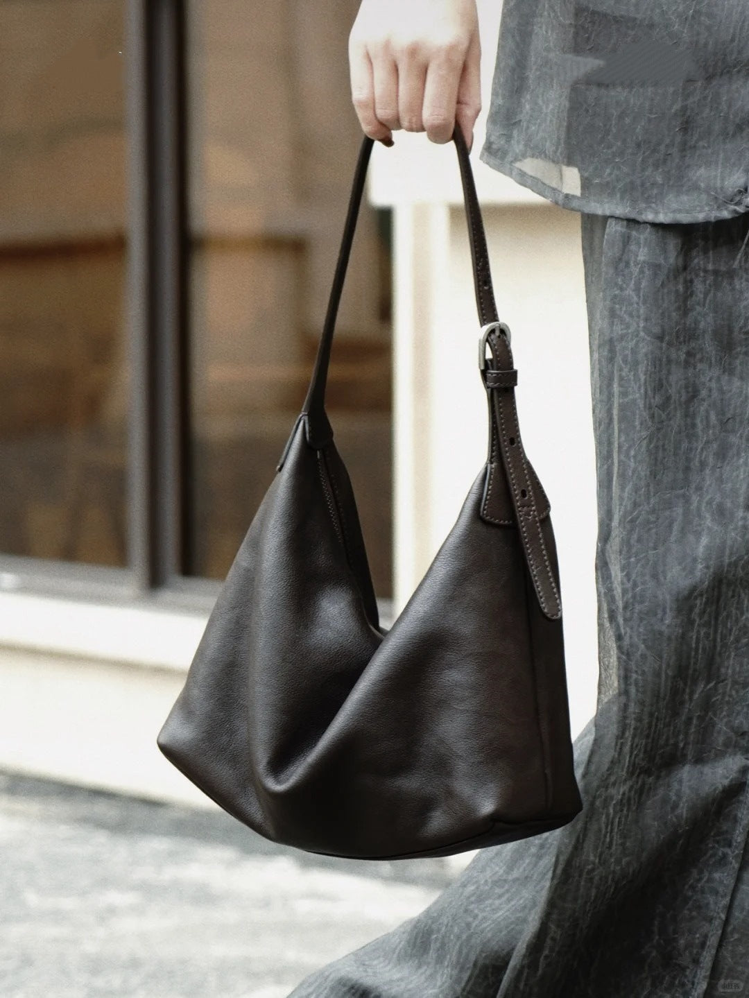 diese minimalistische schultertasche besticht durch ihre weiche form und das luxuriös anmutende lederfinish. der cleane look und die feine handwerkskunst machen sie zum idealen begleiter für den alltag – elegant, funktional und leicht zu kombinieren mit jeder garderobe.