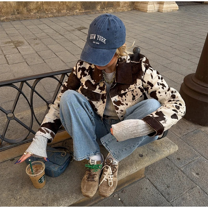 Diese cow-print kurzjacke bringt streetwear-flair in deinen alltag. die weiche felloptik fühlt sich cozy an und setzt ein cooles statement. oversize geschnitten, mit einreihiger knopfleiste – perfekt zu jeans, mini oder cargo. ein it-piece für trendlooks, die auffallen.