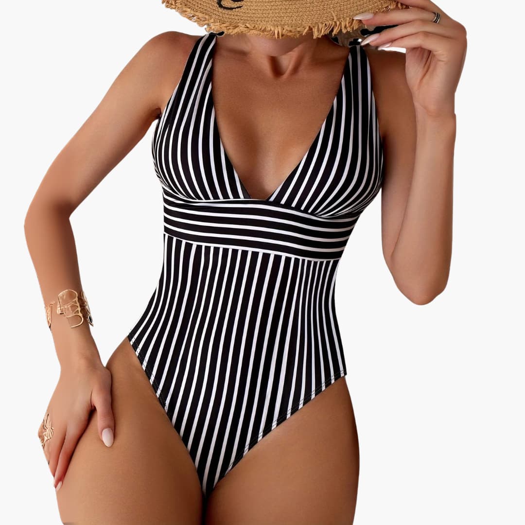 Dieser einteilige Badeanzug für Damen besteht aus leichtem Stoff, der sich ideal für den Sommer eignet. Er verfügt über einen ärmellosen Schnitt, einen tiefen V-Ausschnitt, hoch geschnittene Beinöffnungen und ein gestreiftes Muster, was die Bewegungsfreiheit im und außerhalb des Wassers verbessert. Maschinenwaschbar und pflegeleicht, ist er ideal für den Strand oder den Pool.