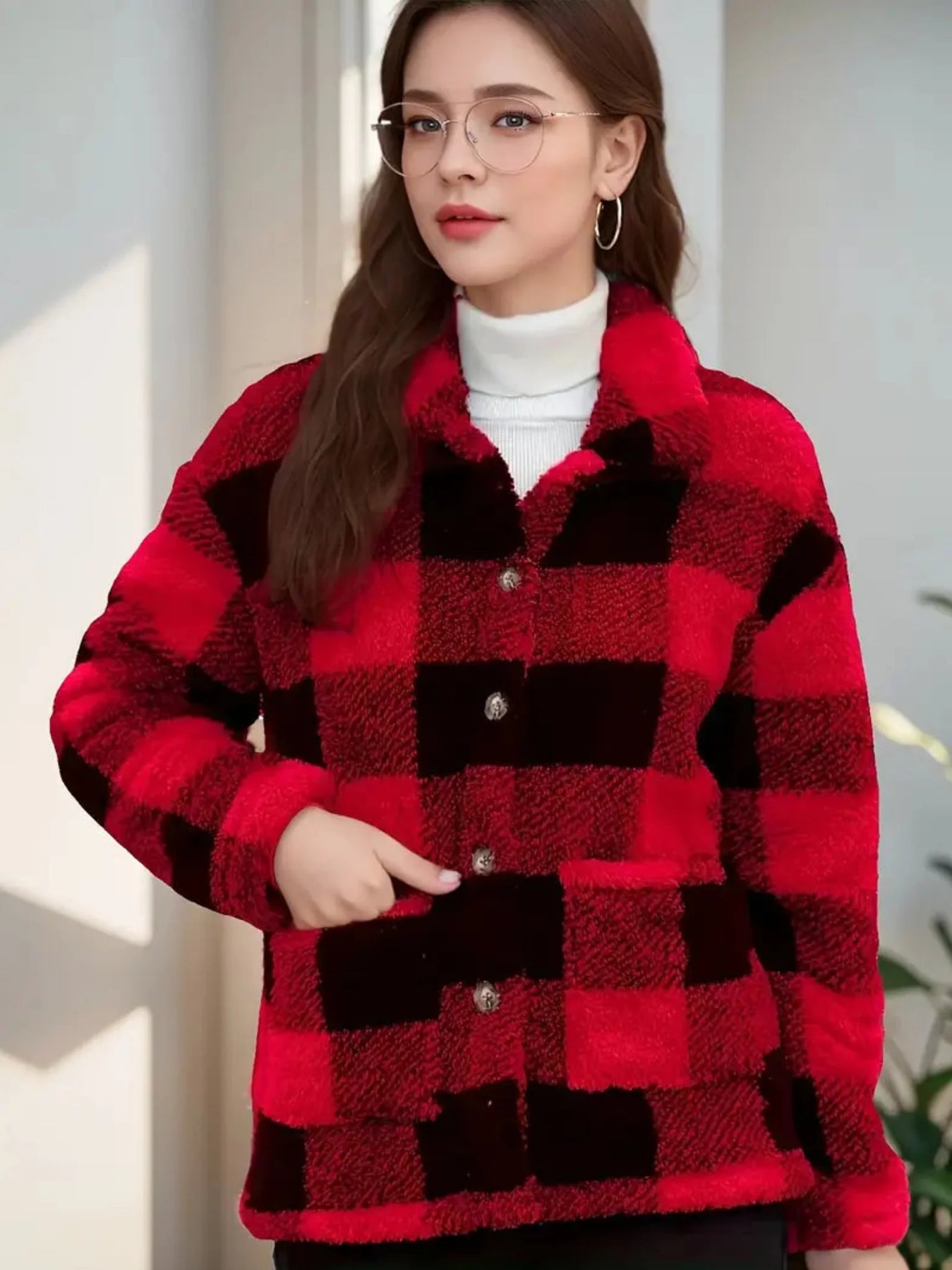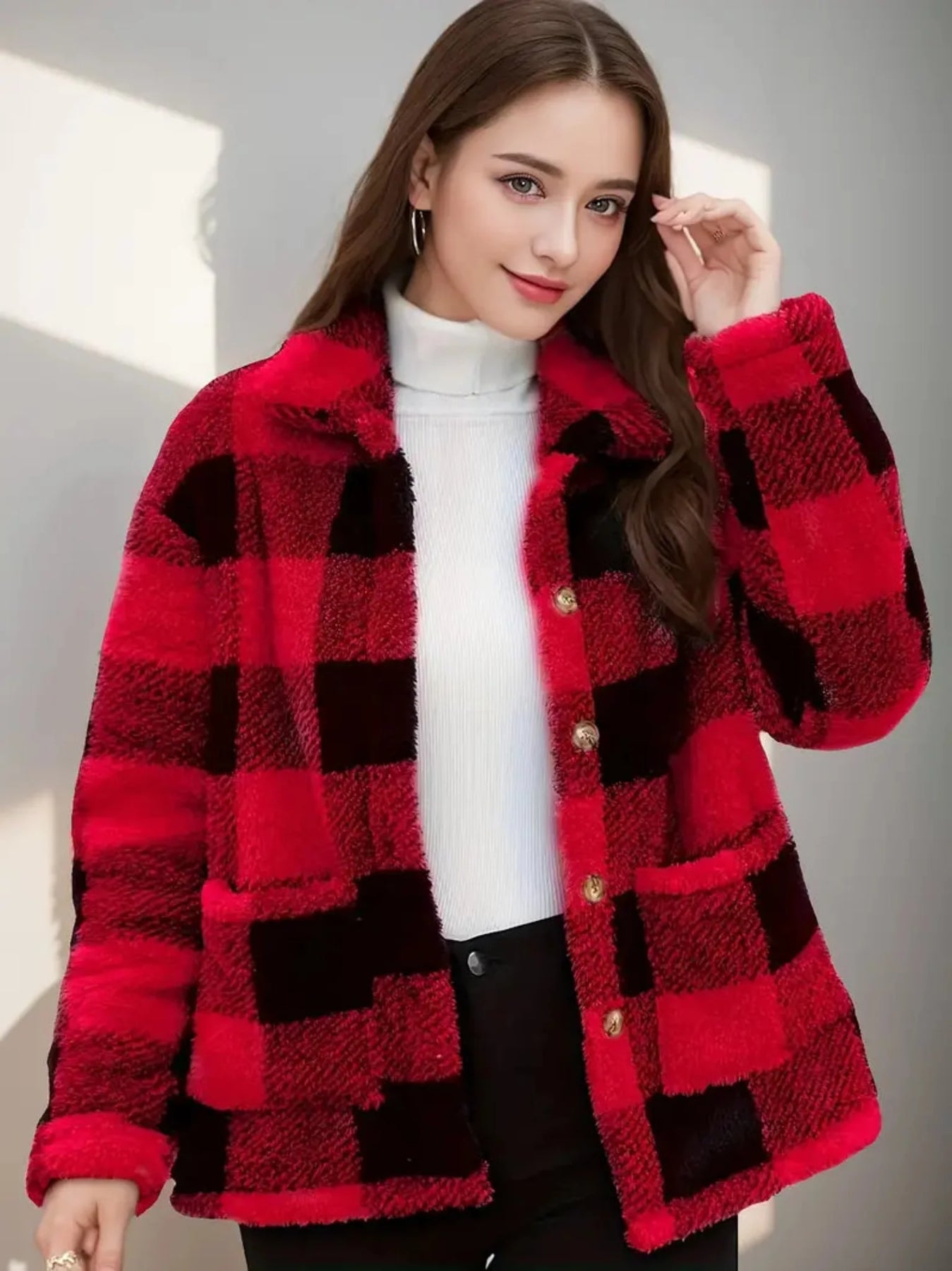 Damen Kuscheljacke Kariert | Knopfverschluss mit Kragen