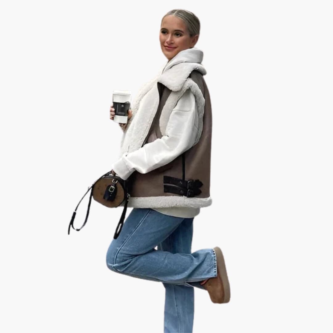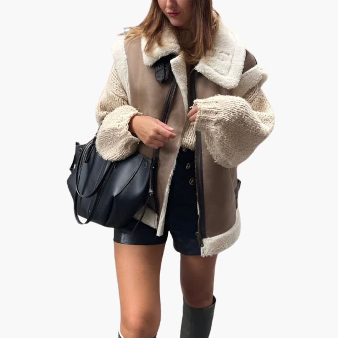Kragen: Weiter Umlegekragen mit sichtbarem Teddyfellfutter am Rand.