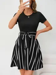 Edna | Neu Gestreiftes Patchwork-Kleid in A-Linie mit Kordelzug