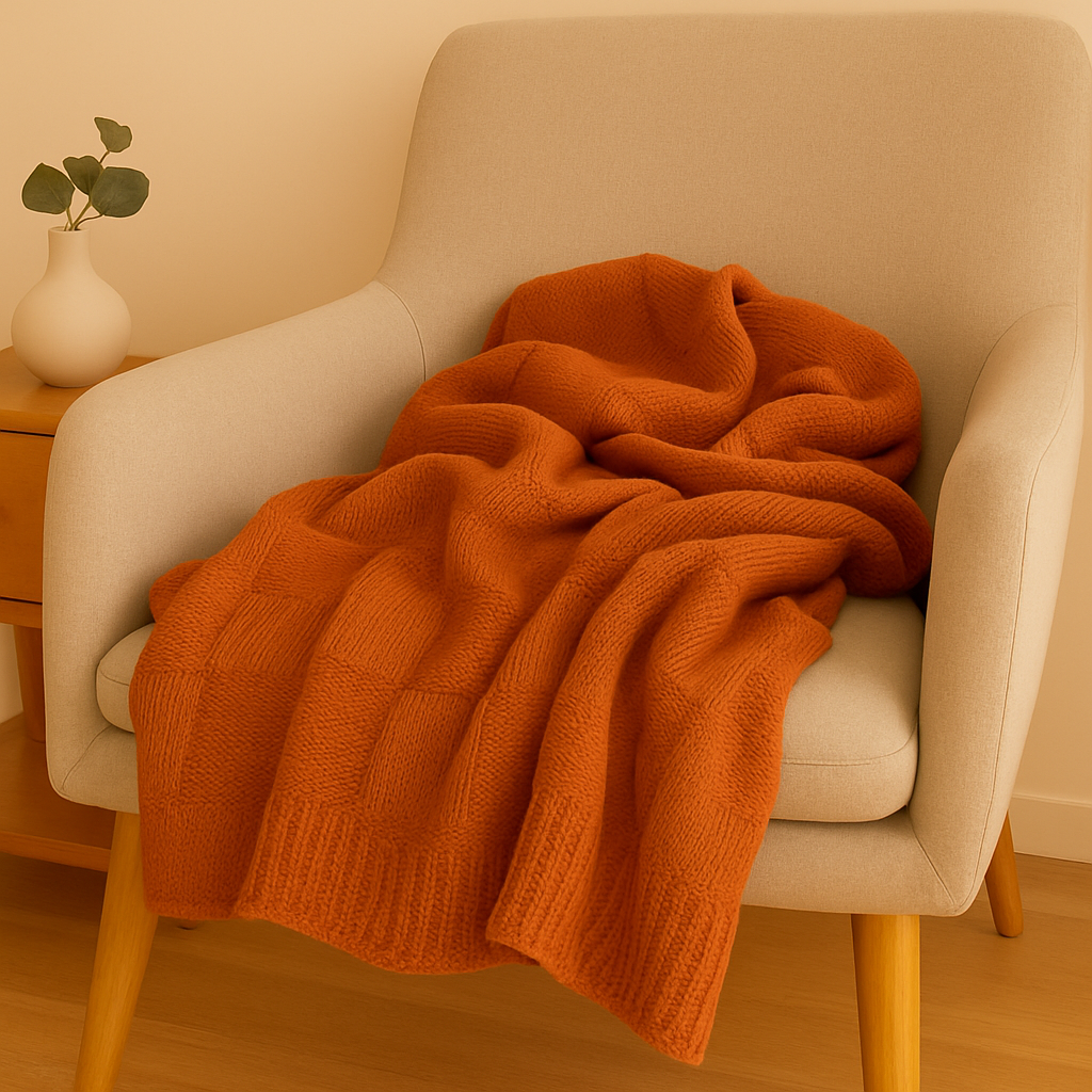 Diese weiche Strickdecke verleiht jedem Raum Geborgenheit. Im sanften Orangeton gestaltet, schafft sie gemütliche Momente auf dem Sofa, im Büro oder beim Camping und bietet vielseitige Einsatzmöglichkeiten.
