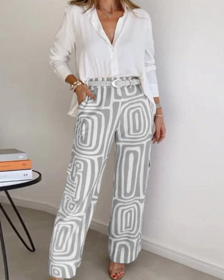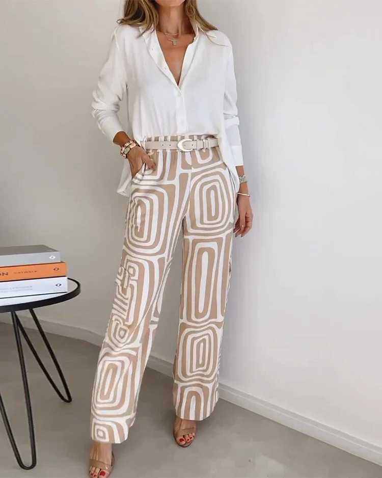 • Gestaltung: Zeitlos weiße Bluse mit klassischem Kragen & stilvoll gemusterter Hose