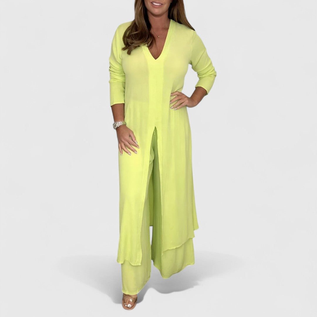 Bereit, deine Frühlingsgarderobe aufzuwerten? Unser beliebtes Zweiteiler-Outfit Margherita wurde für alle entworfen, die Komfort lieben, ohne auf Stil zu verzichten. Dieses schicke Ensemble vereint mühelose Eleganz mit einem frischen Look, der dich in dieser Saison strahlen lässt!