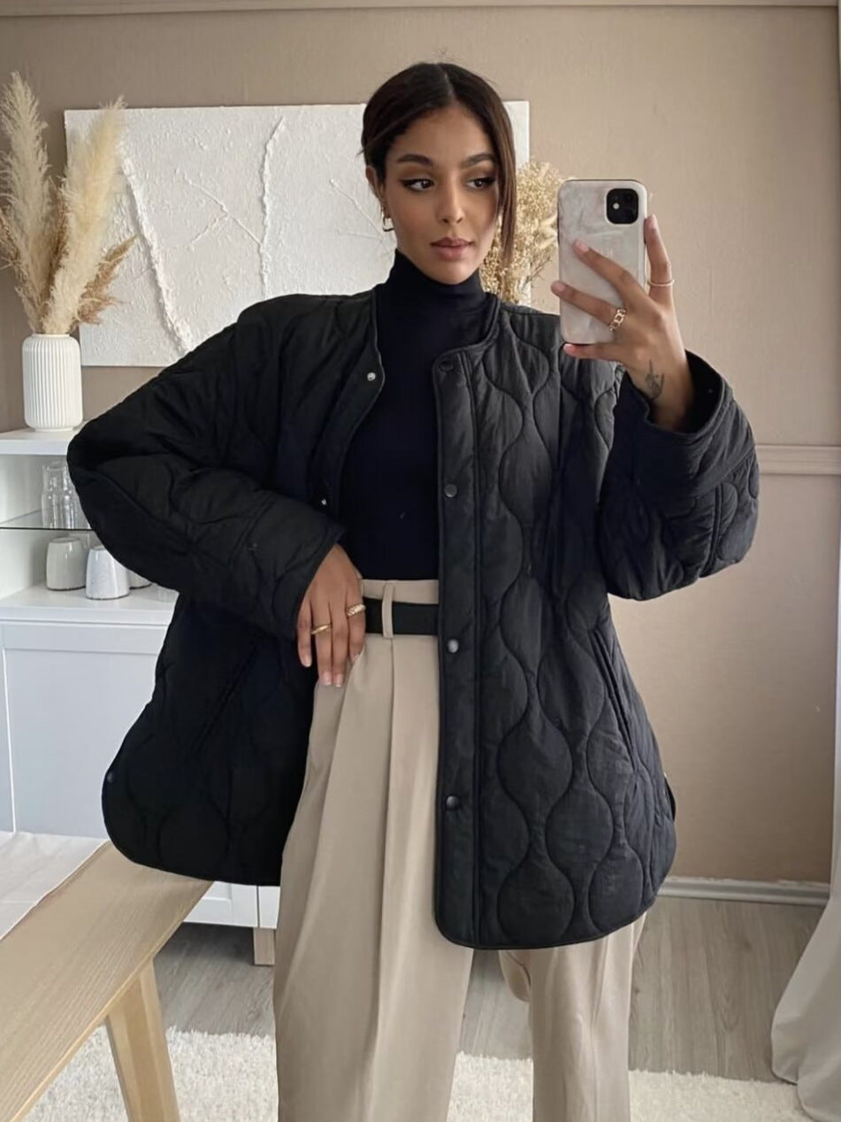 Diese gesteppte baumwolljacke verkörpert minimalismus und komfort in perfekter balance. das weiche material mit eleganter wellensteppung sorgt für eine angenehme wärme, während der runde ausschnitt und die gerade passform einen modernen, cleanen look schaffen. ideal für jeden tag – leicht, stilvoll und mühelos kombinierbar.
