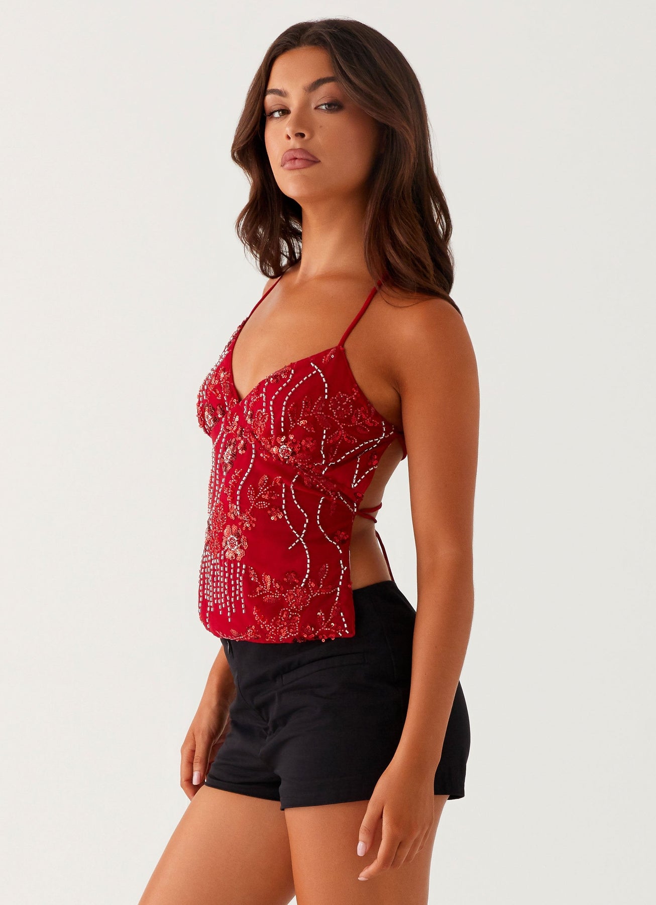 Dieses Top ist pure Verführung – mit zarten Trägern, tiefem Ausschnitt und einem Hauch von Glanz. Die funkelnden Pailletten machen es zum perfekten Highlight für besondere Abende, Festivals oder Dinner-Dates. Das leichte Material schmiegt sich weich an die Haut und sorgt für ein luftiges Tragegefühl. Du brauchst nur noch ein Lächeln – und dieses Top – um zu strahlen.