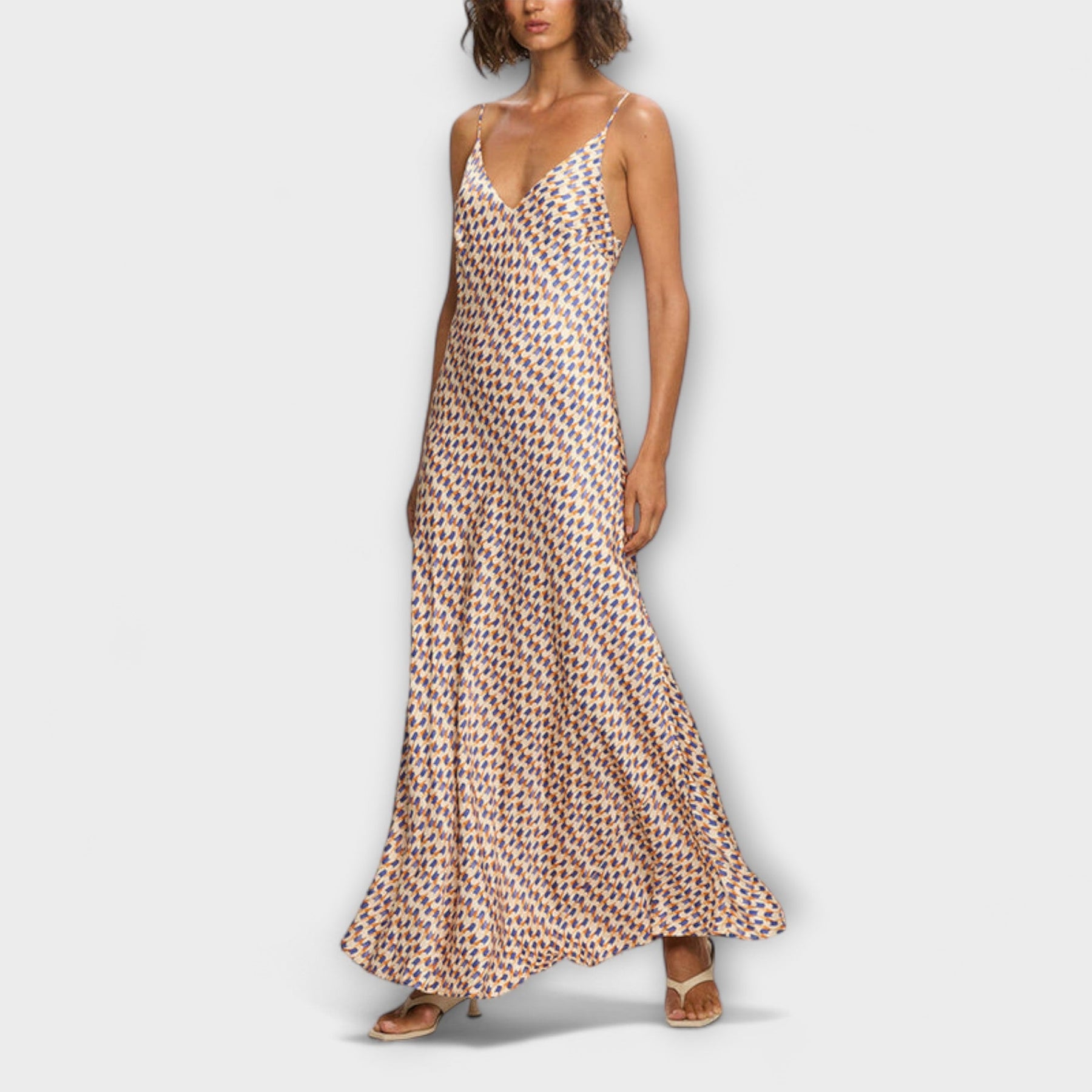 Setzen Sie ein Statement mit müheloser Eleganz in unserem atemberaubenden Maxikleid mit Trägern. Mit einem schickem geometrischen Druck kombiniert dieses Kleid moderne Kunstfertigkeit mit zeitloser Eleganz.